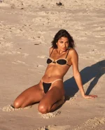 Biquíni Cacau Ébano – Sutiã meia-taça com amarração nas costas e alças com regulagem banhada a ouro, combinando charme e sustentação. Calcinha cortininha com rolotê duplo, que permite ajuste e valoriza a silhueta. Confeccionado em malha Carmel com textura, nas cores areia e preto uma combinação rica e sofisticada que realça o bronzeado. A malha é super macia, com forro em poliamida (não entra areia), confortável e com proteção UV FPU 50+.