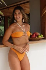 Biquíni Cathê Mango – Top tomara que caia, rolotê com opção de diversas amarrações, aviamentos em acrílico e calcinha asa-delta. Confeccionado na malha carmel, nas cores laranja, conhaque e frais, deixando o conjunto ainda mais lindo. A malha é super macia, com forro duplo (forrado com o mesmo tecido), confortável e com proteção UV FPU 50+.