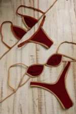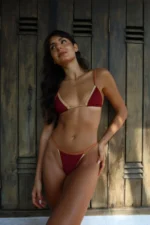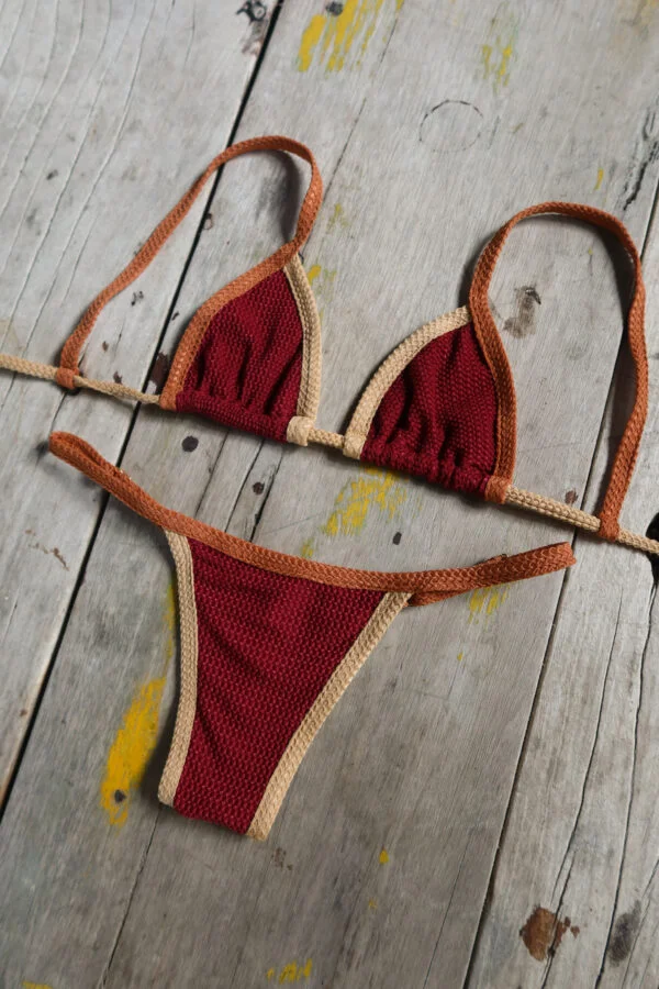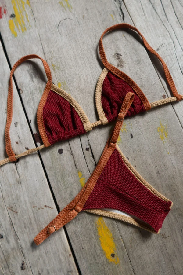 Biquíni Maysa Carmel Carmin – Sutiã cortininha com casinha na alça, dando a opção de usar modelo camisetinha (ombro) ou amarrado no pescoço e calcinha com reguladores para que você possa ajustar ao quadril da forma mais confortável e bumbum fio duplo. Confeccionado na malha carmel nas cores carmin, conhaque e areia, deixando o conjunto ainda mais lindo. A malha é super macia, com forro suplex (não entra areia e não deixa transparente), confortável e com proteção UV FPU 50+.