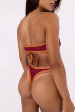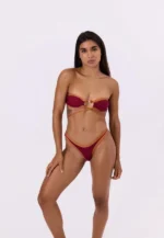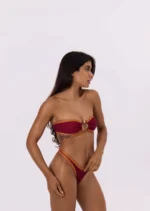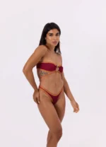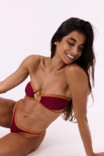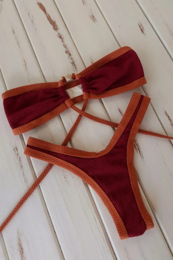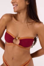 Biquíni Mia Carmin – Top tomara que caia, rolotê com opção de diversas amarrações e calcinha asa-delta. Malha com textura atoalhada na cor Carmin e conhaque, aviamentos em acrílico e acabamento em viés deixando o conjunto ainda mais lindo. A malha é super macia, com forro suplex (não entra areia), confortável e com proteção UV FPU 50+.