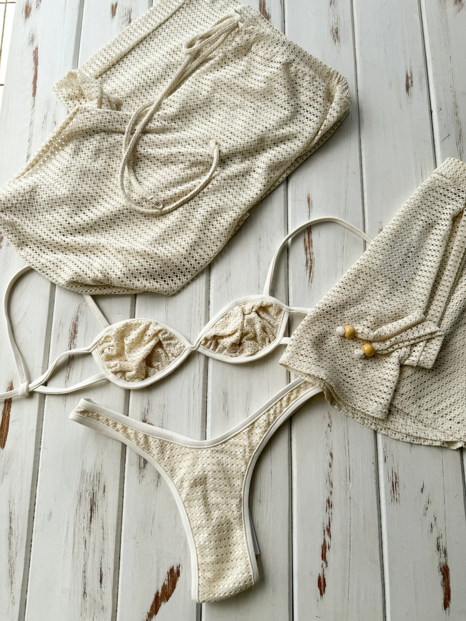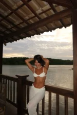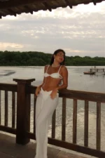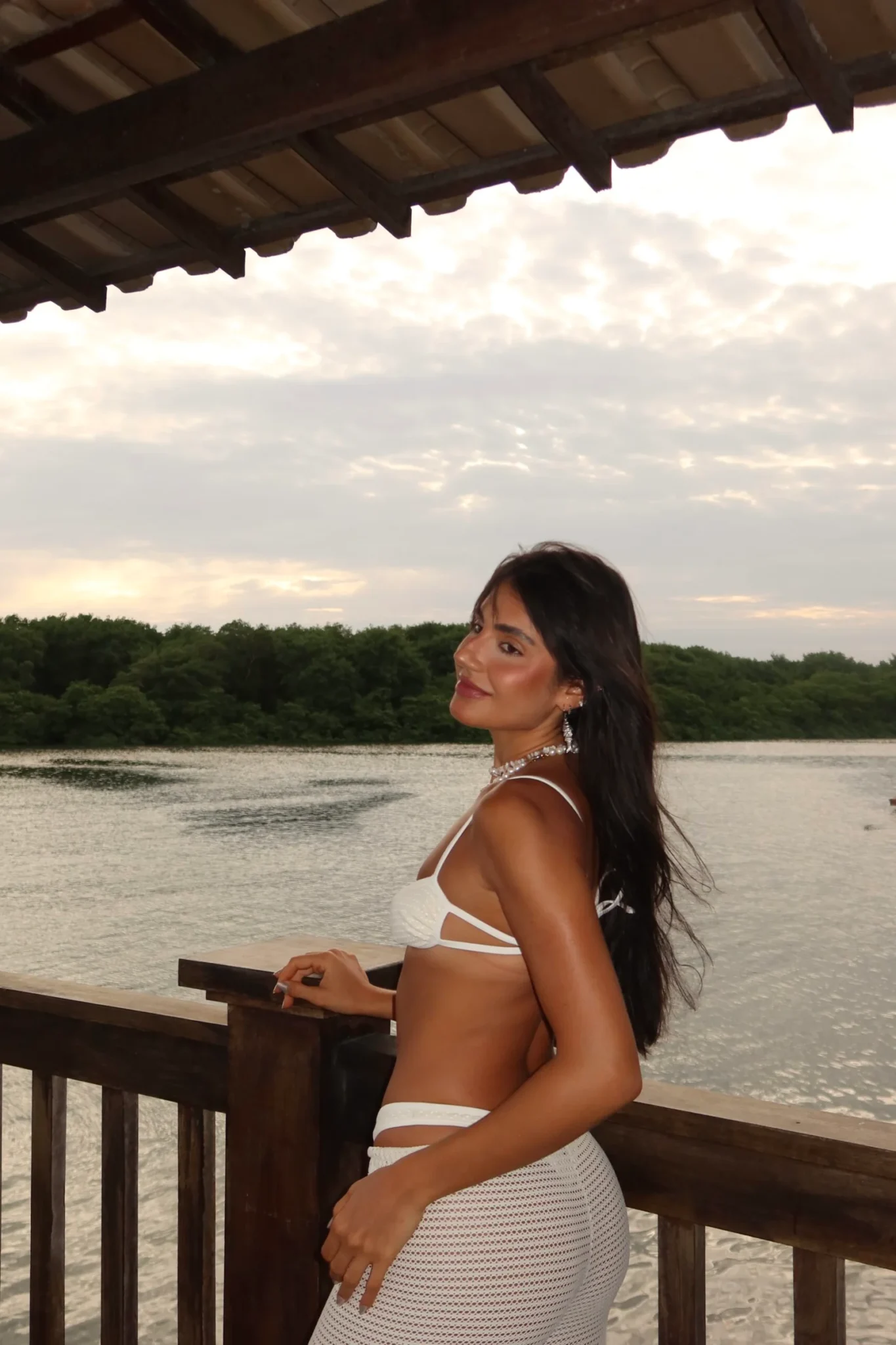 Calça Bella Barbante – Calça pantalona, com amarração, ponteira madre-pérola. Malha rendada na cor barbate, possui toque macio e agradável.