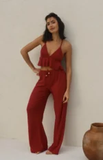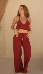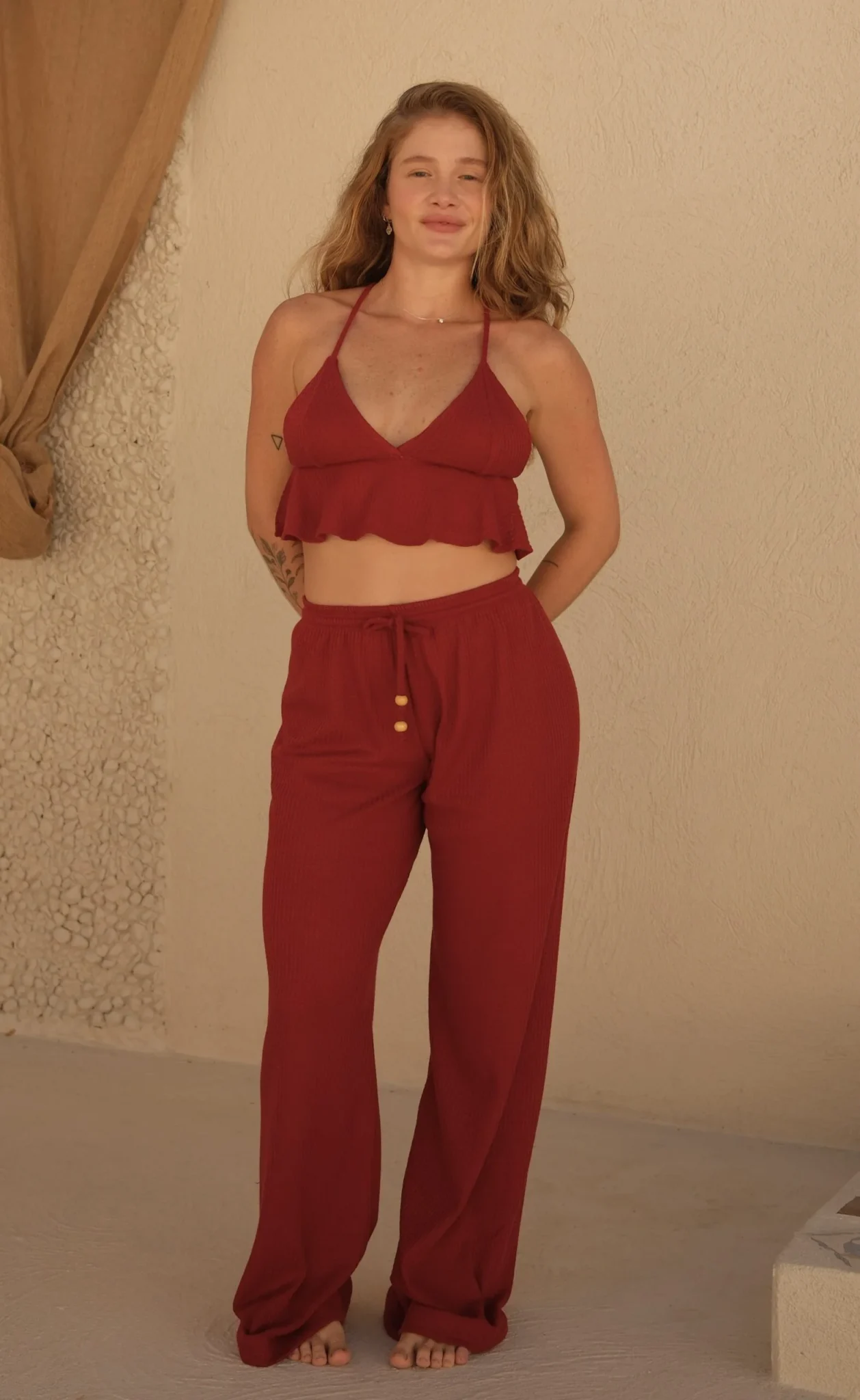 Calça Cecilia Carmim – Calça pantalona e cós com elástico para ajuste confortável ao corpo. Confeccionada em tricot de toque macio, com caimento leve e sofisticado. Uma peça prática, com mood descomplicado e elegante ao mesmo tempo.
