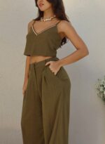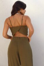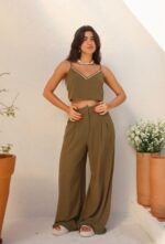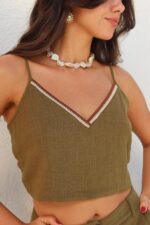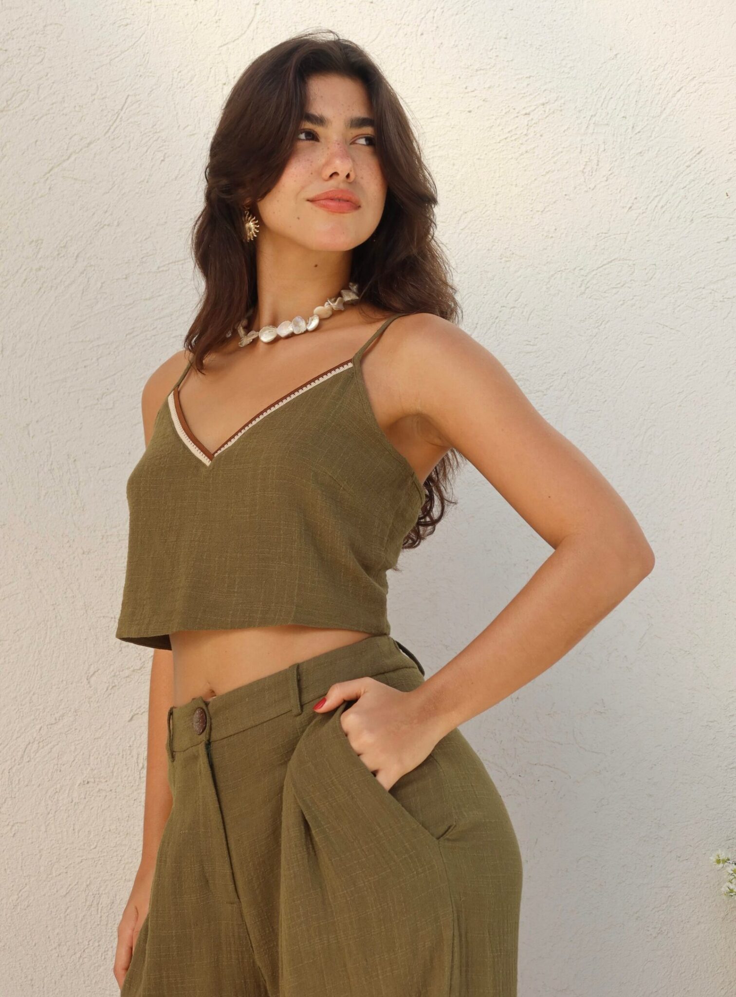 Cropped Sara Militar – O Cropped Sara é leve, fresco e cheio de charme. Com alcinhas finas e decote em V, ele traz um detalhe em contraste que dá um toque discreto, mas que faz a diferença. O tecido tem toque macio e um caimento que funciona bem tanto em looks mais relax quanto quando você quer um look mais elaborado. A parte de trás tem um recorte diferente, que dá personalidade e deixa o visual interessante de todos os ângulos. Ele é básico na medida, com um toque moderno que vai bem em várias ocasiões.