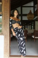 Cropped Zaya Pena – Cropped estilo ciganinha com decote ombro a ombro, mangas 3/4 com acabamento franzido nos punhos, detalhe frontal com argola em acrílico roliça e elástico nos ombros, cintura e punho dando um acabamento franzido e ajustando a peça ao corpo. Tecido de viscose, estampa poá e folhas tropicais. Cropped lindo que trás um estilo despojado, praiano além de trazer uma leveza no seu look.