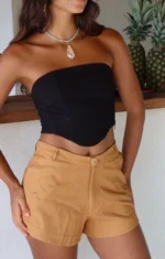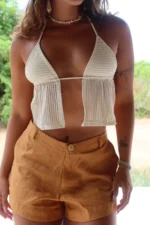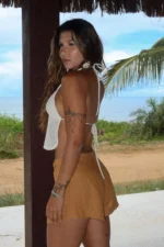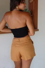 Short Isis Marrom – Possui bolso faca na lateral, zíper e botão. Tecido Mix de Linho.