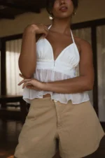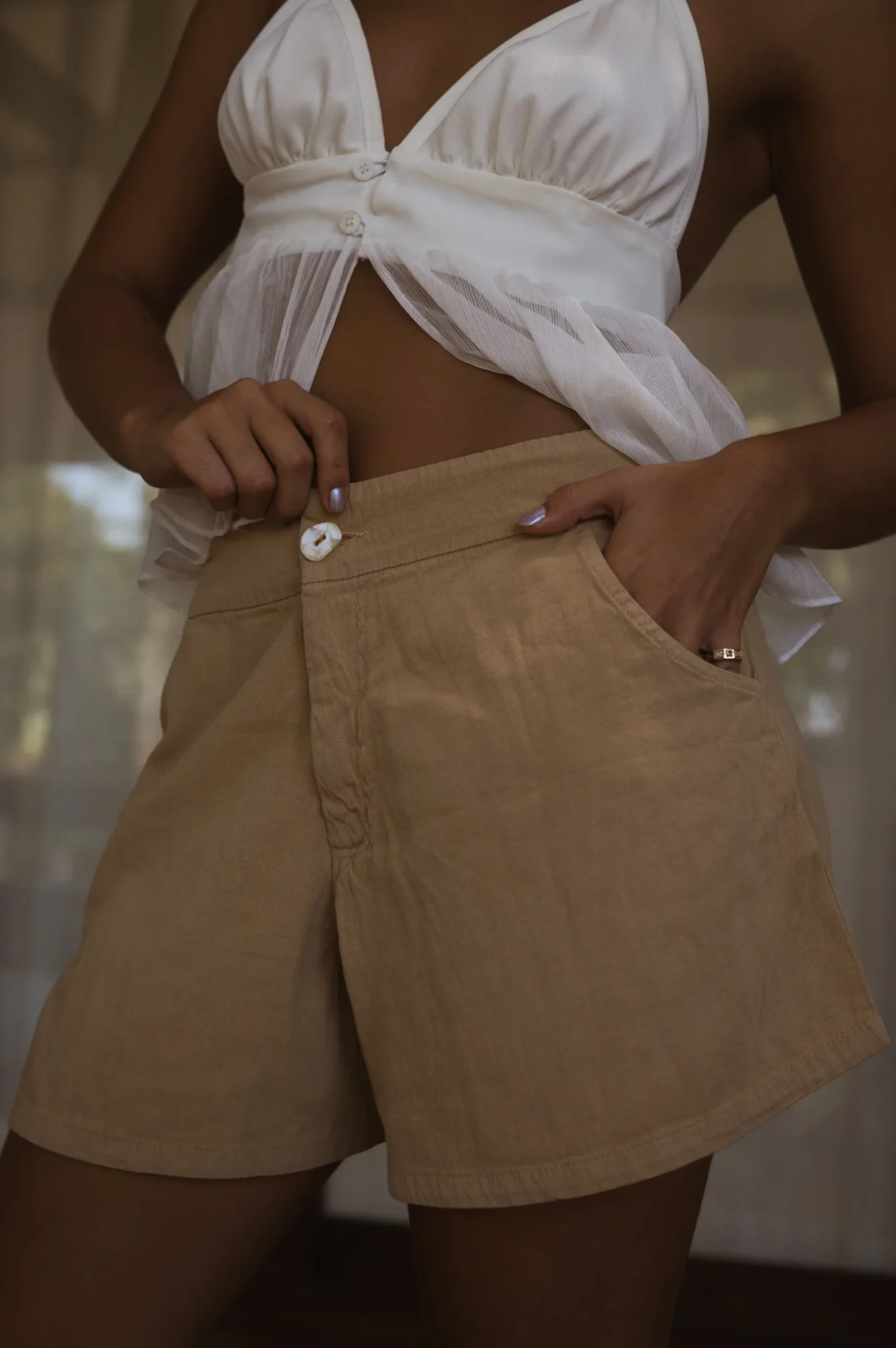 Short Raya – Possui bolso faca na lateral, zíper e botão de madrepérola. Tecido Mix de Linho.