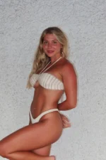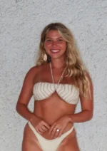 Top May Crochê – Top em crochê com trama em chevron e toque acetinado dourado que dá um brilho sutil à peça. Versátil, pode ser usado como tomara que caia ou com amarração no pescoço.