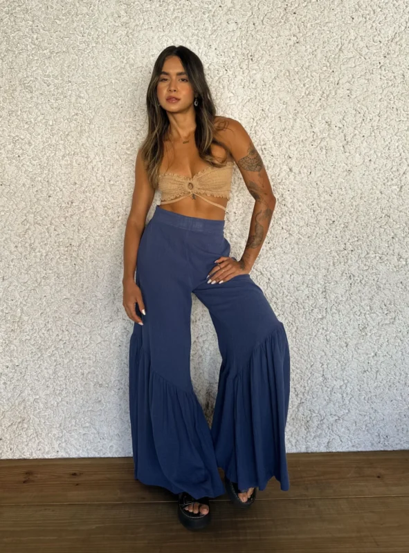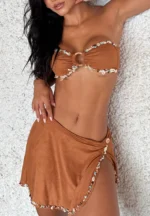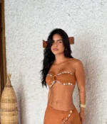 Top Sereia Conhaque – Top Faixa com amarração atrás, argola de metal com acabamento imitando madeira e bordado. Tecido suéde, na cor conhaque, com toque macio e agradável.