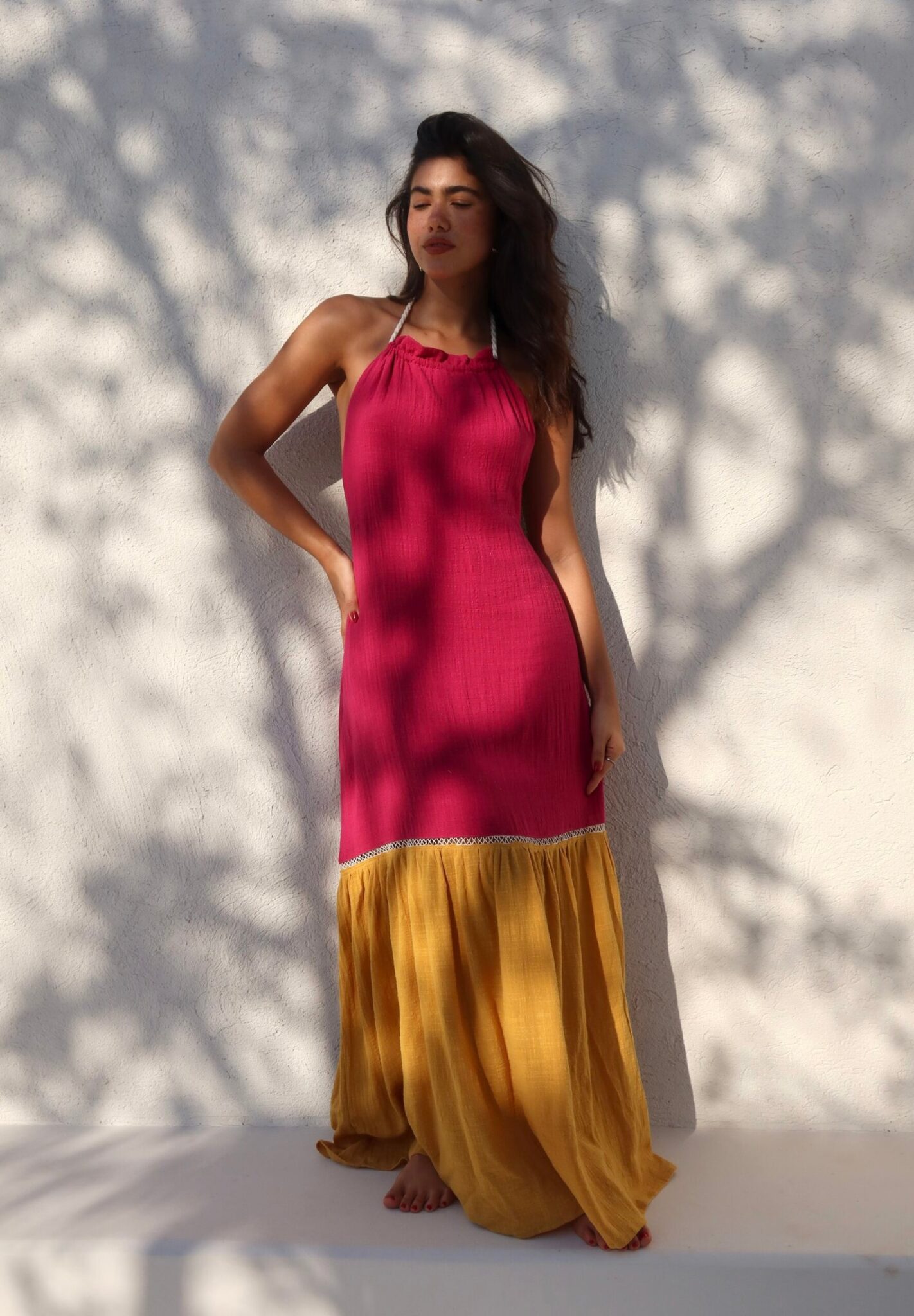 Vestido Iza Pitaya- modelagem frente única, com decote U nas costas e elástico para acentuar a peça e dar maior conforto, cordão de algodão são francisco. Confeccionado em Contton rústico na cor pitaya e mostarda, aplicação rústica bordada. Esse tecido tem um caimento perfeito!!