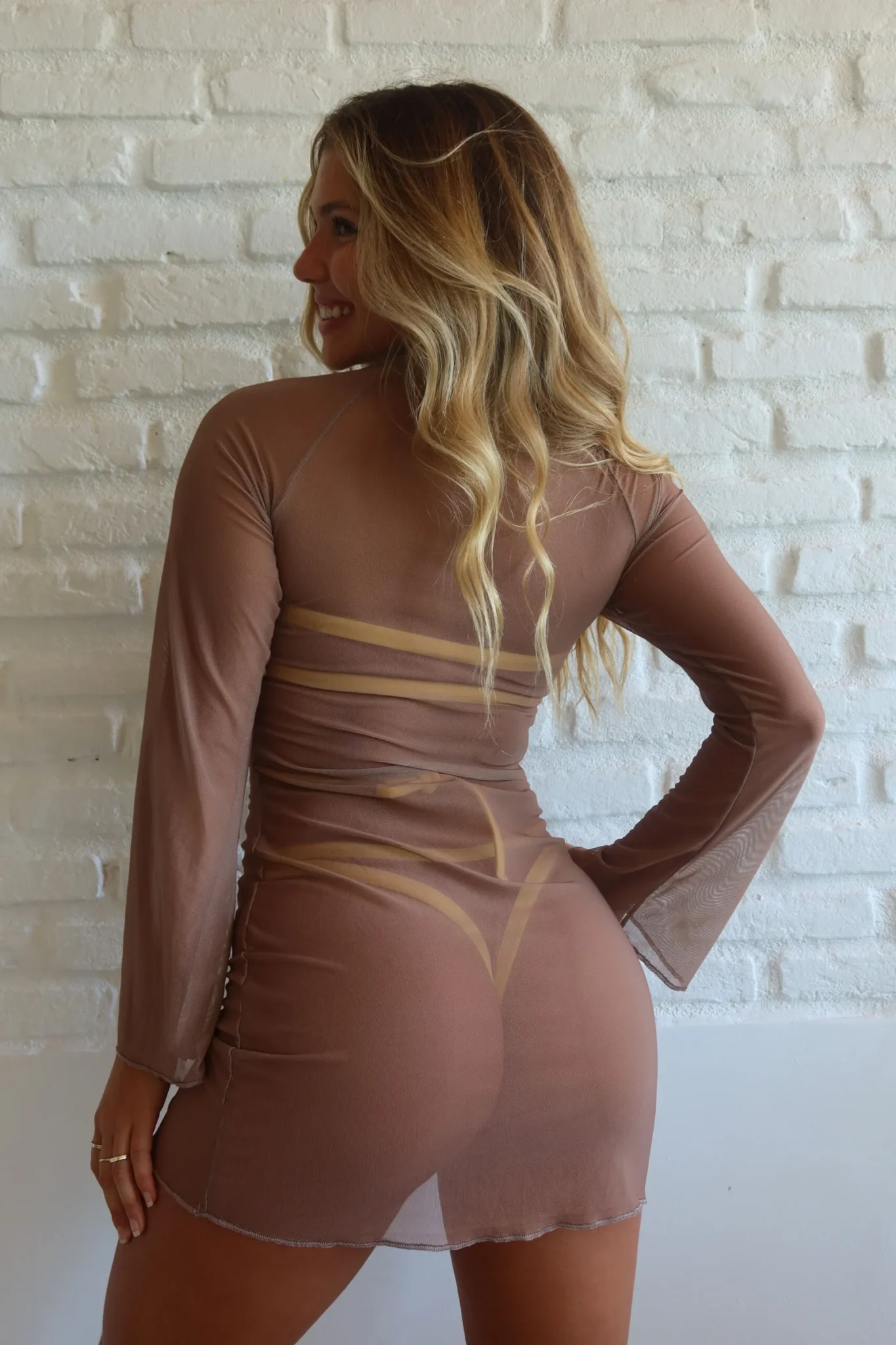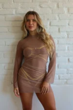Vestido Lara Marrom – Vestido curto em tule transparente com manga longa e gola fechada. A cor marrom cria um visual neutro e moderno, enquanto a modelagem ajustada e o tecido leve destacam a silhueta com sensualidade e estilo.