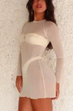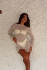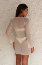 Vestido Lara Off white – Vestido curto em tule com fios de lurex, leve e com brilho sutil. Modelagem ajustada, manga longa e gola fechada que contrastam com a transparência, criando um visual sofisticado e sensual.