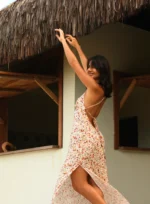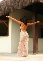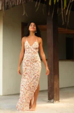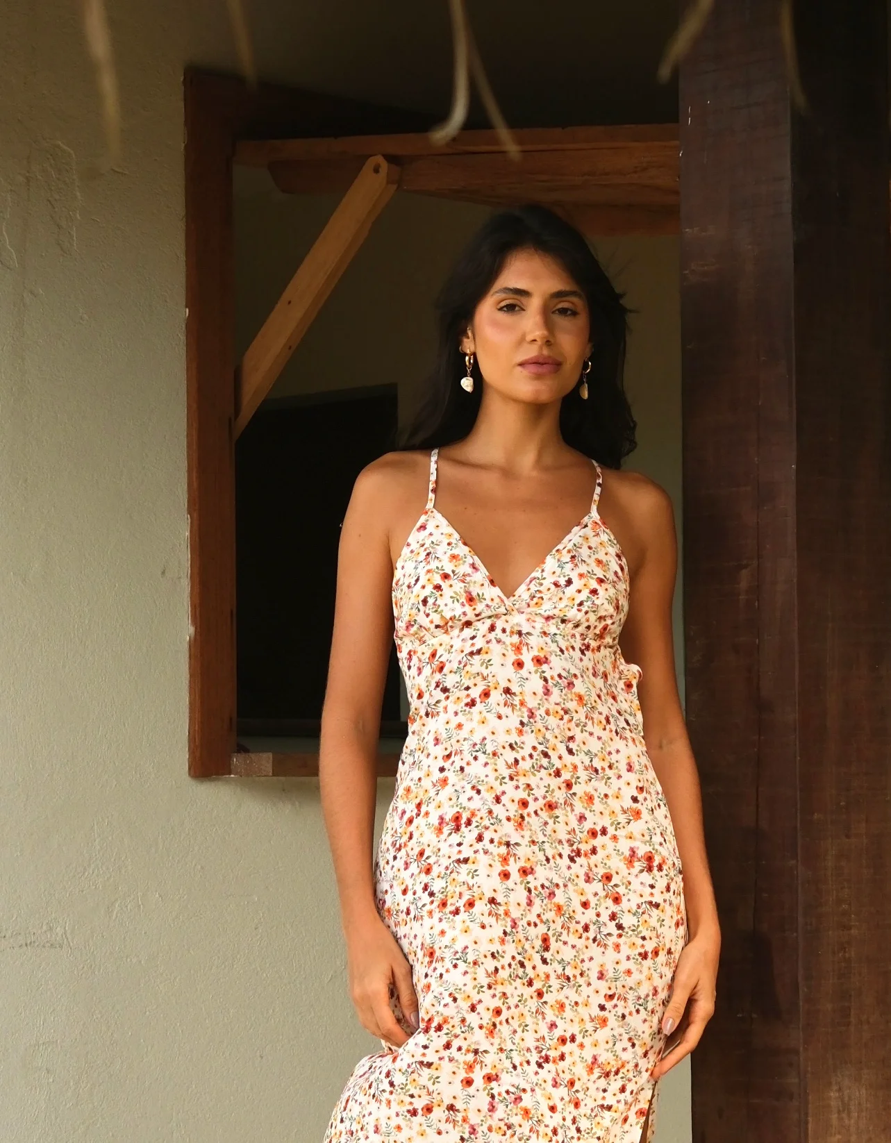 Vestido Mia Açucena – Vestido longo com alças finas entrelaçadas e amarração nas costas. Confeccionado em viscose na estampa Açucena, tem caimento leve e modelagem soltinha que valoriza o movimento do corpo.